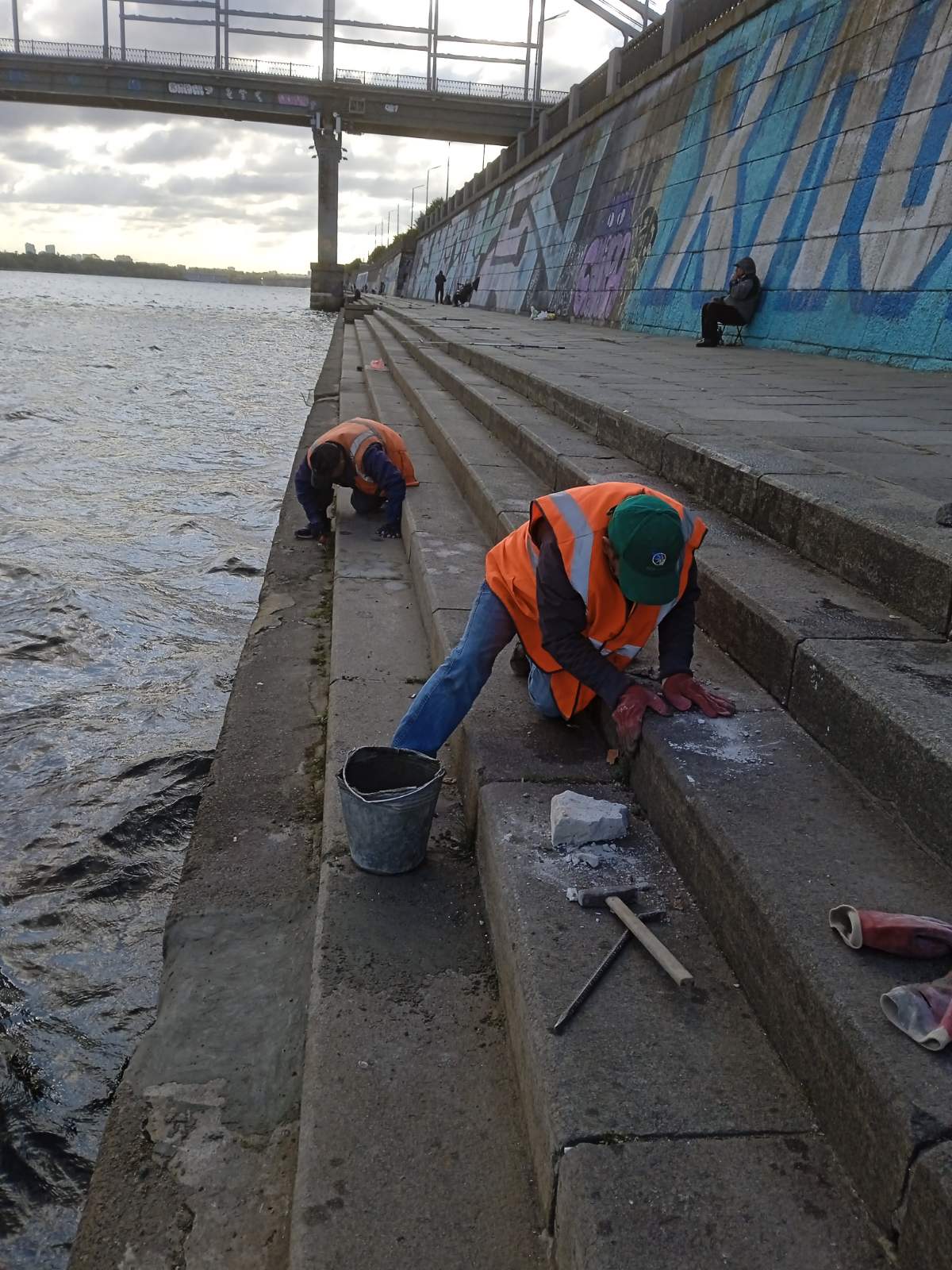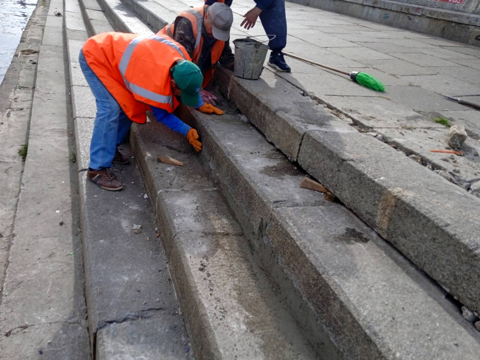 Чистка лотків, прибирання променадного майданчика, зашпарування щілин між плитами променадного майданчика та ремонт сходів Гранітної Набережної