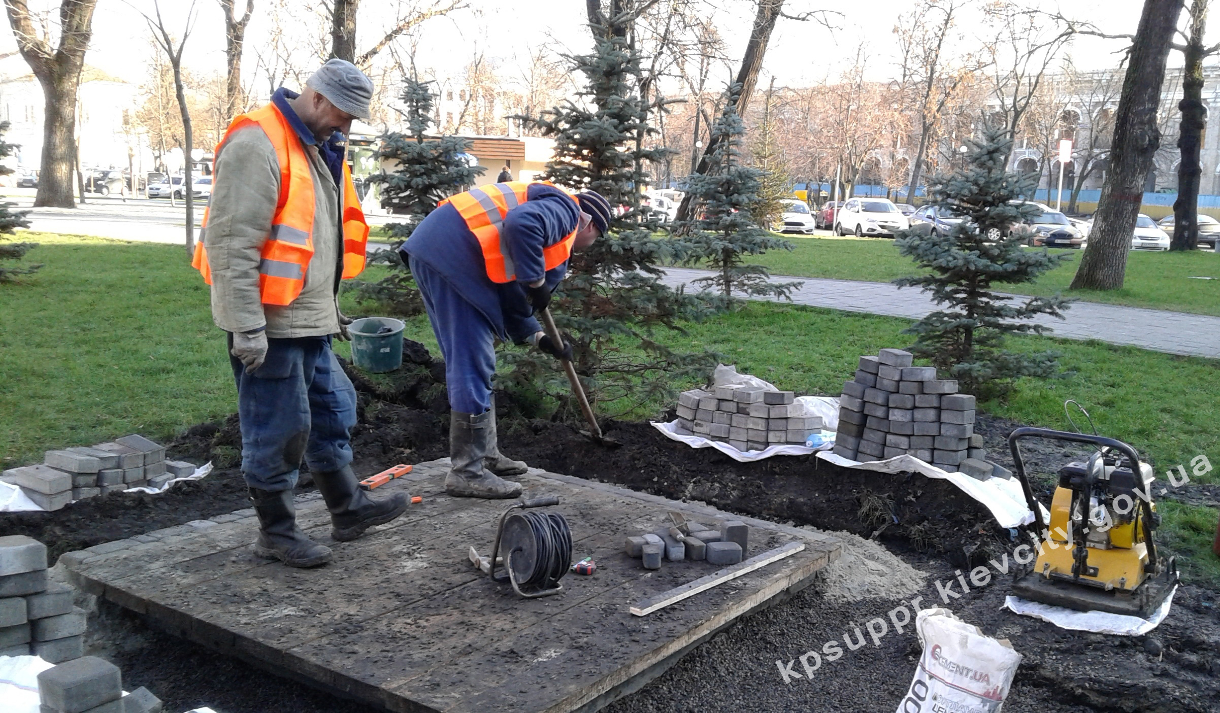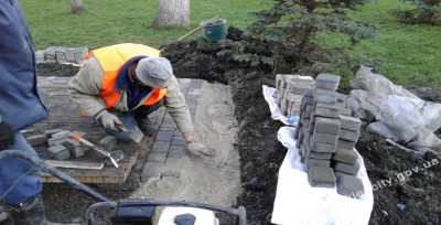 Після встановлення підземних контейнерів для сміття в сквері на Контрактовій площі, робітниками виконується благоустрій території.