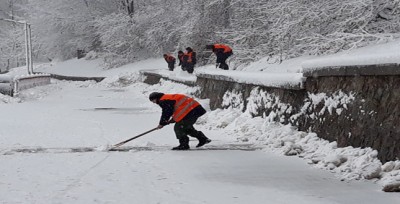 Очищення водовідвідних лотків та зливоприймачів від снігу біля Пішохідного мосту на Набережному шосе