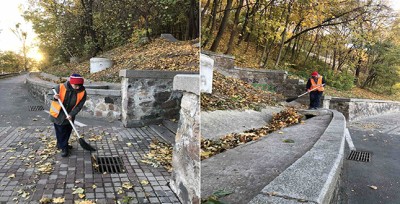 Прибирання листя з лотків і зливоприймачів на території Пішохідного мосту працівниками дільниці №1