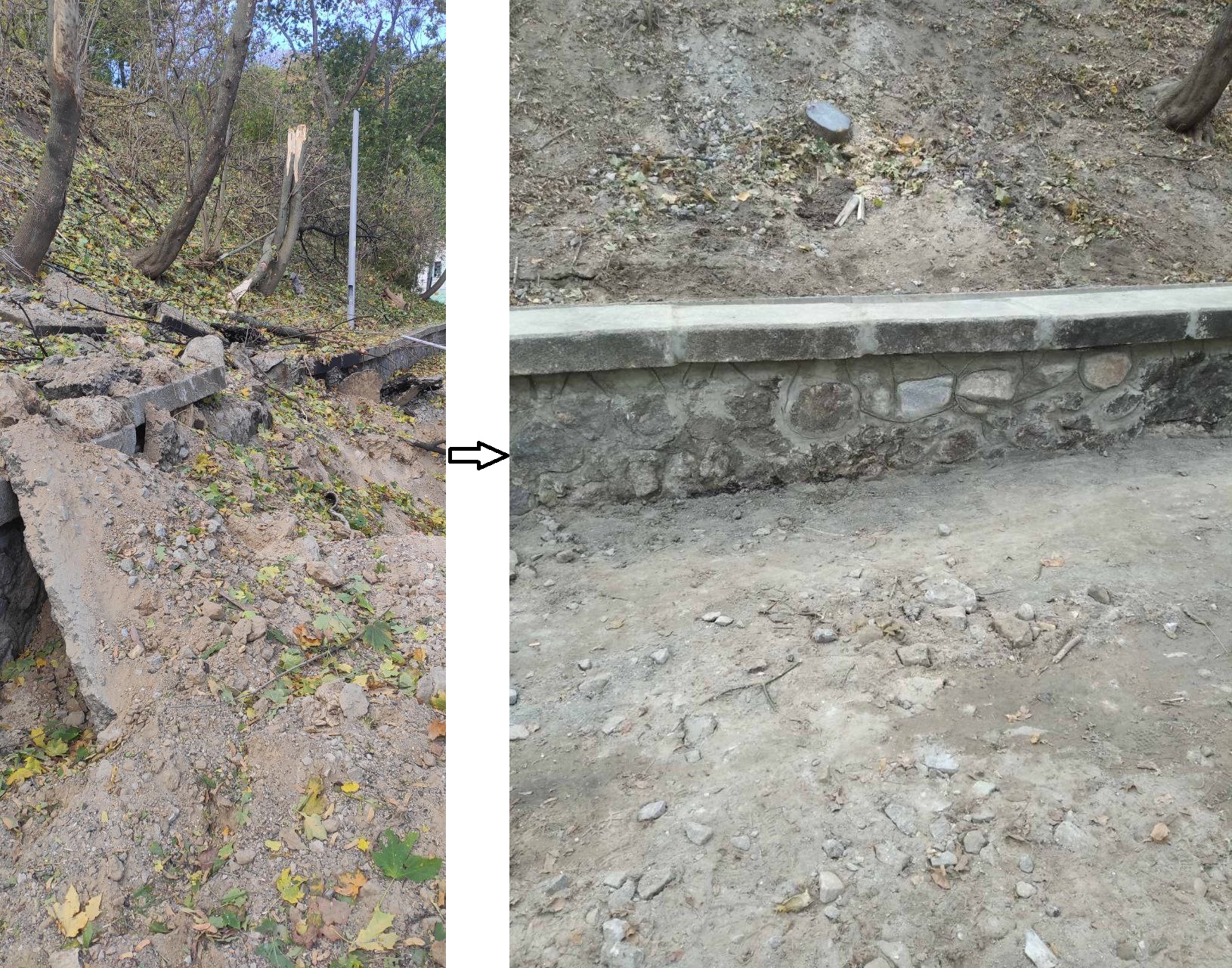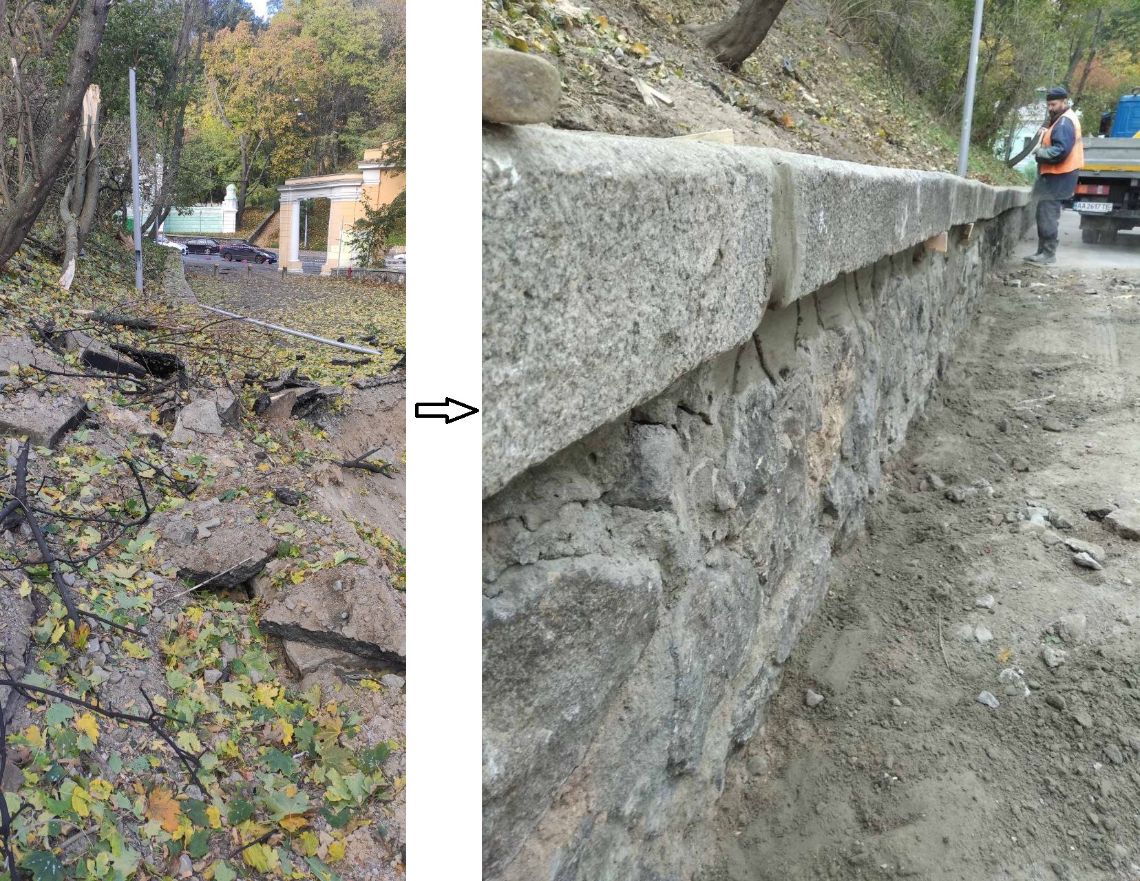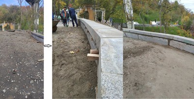 Роботи з ремонту підпірних стін, зруйнованих внаслідок ракетного удару у підніжжі пішохідно-велосипедного скляного мосту